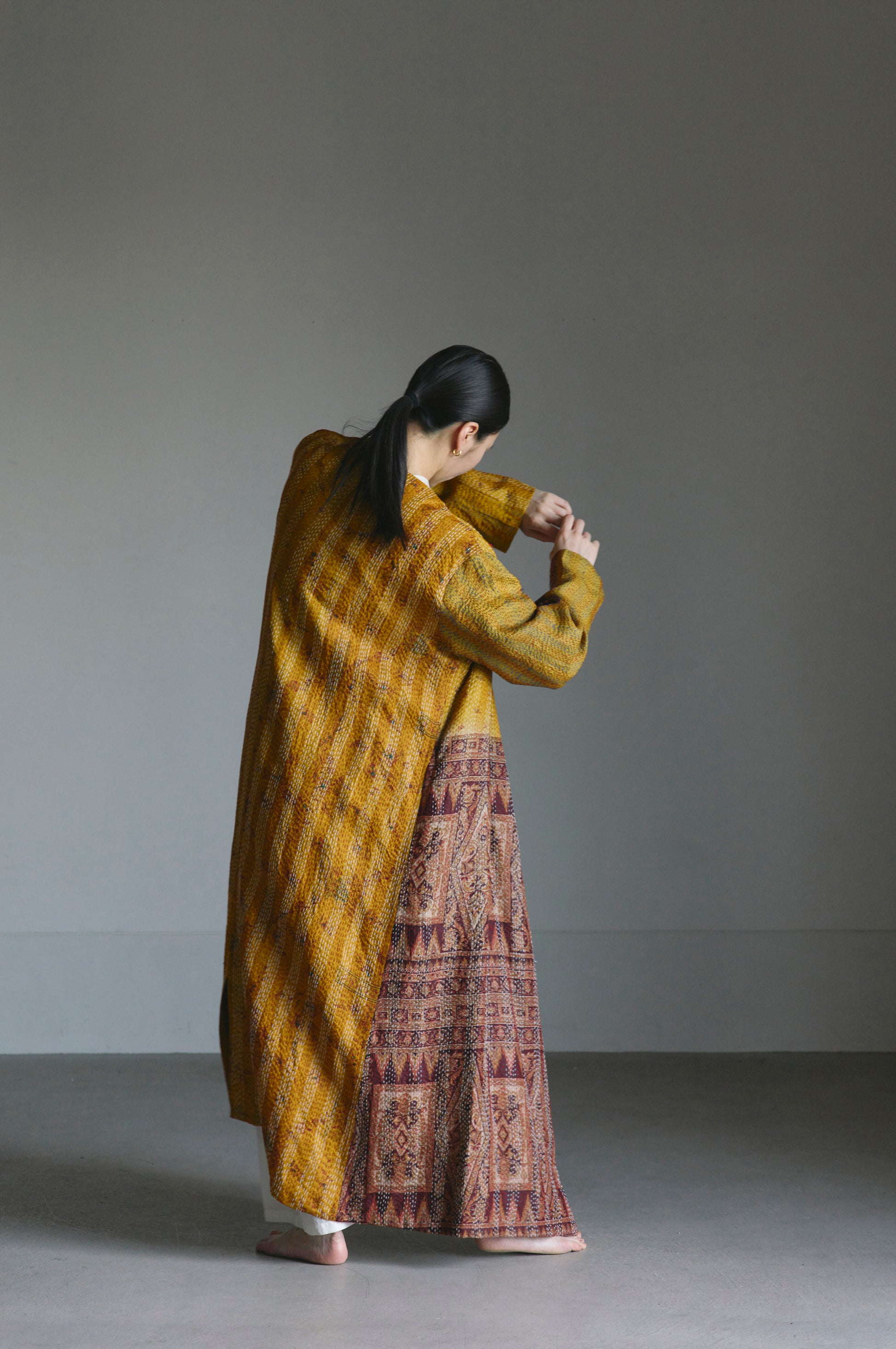 時を越えて私たちのもとへ巡ってきたその布を、リバーシブルで楽しめるローブに仕立てました。複数枚の布を組み合わせて整えた表側と、偶然性から生まれる力強さを持つ裏側、どちらの表情もお楽しみください。